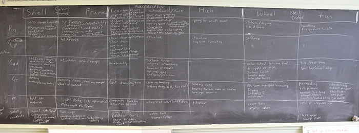 We’ve started by breaking up the design into a series of sub-components, and for each sub-component we brainstorm how it can be designed to improve each of the metrics in the list above. The result of our first brainstorming session was an awesome design matrix with loads of ideas for improving each system in some ways that we hadn’t fully considered before.